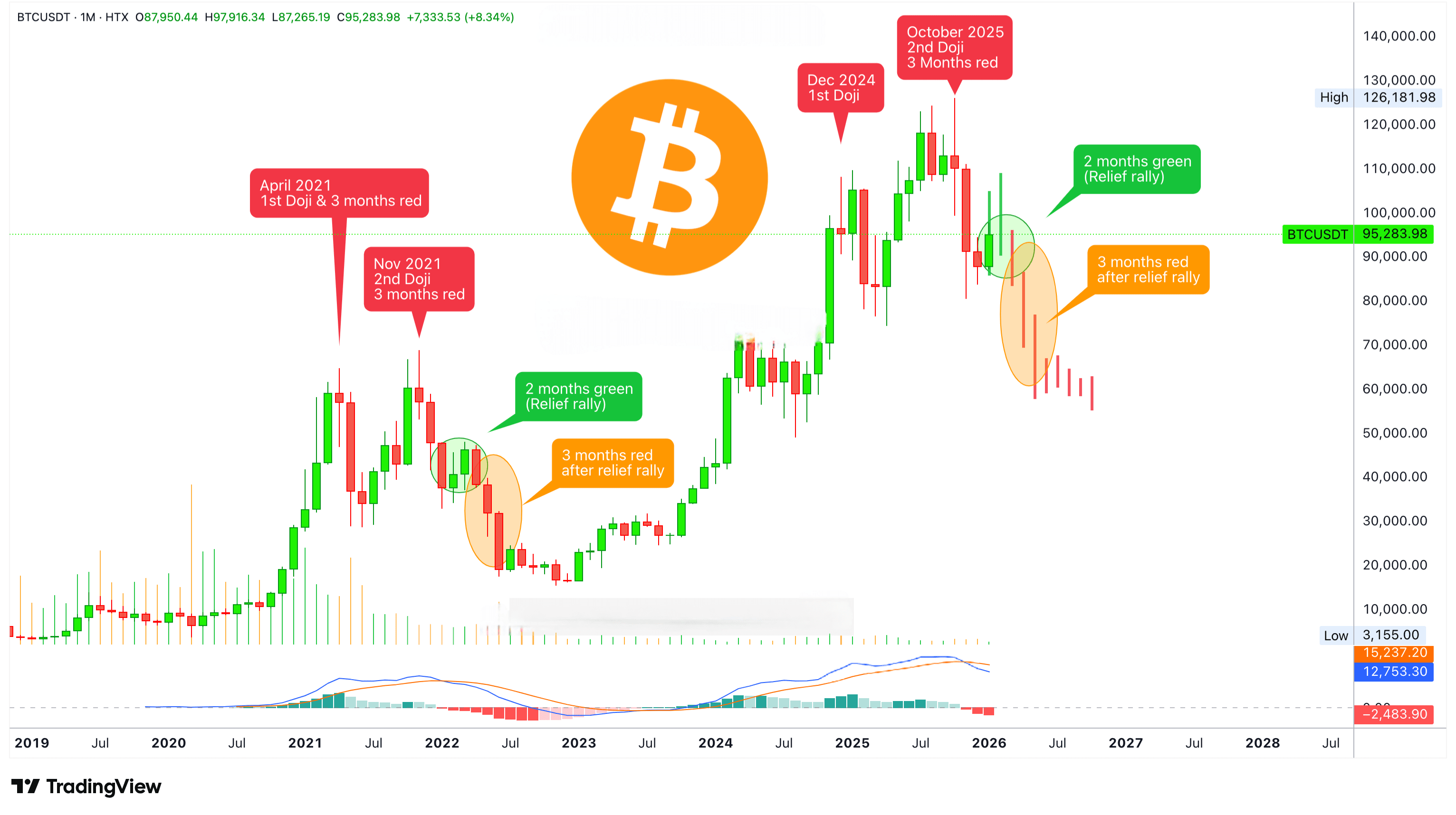 W grudniu 2024 roku Bitcoin produkuje pierwszego Doji. To pokazuje, że rynek byka zbliża się do końca. Ten sam proces z 2021 roku powtarza się i otrzymujemy drugi szczyt, tym razem kończący się w październiku 2025 roku, gdy pojawia się drugi Doji. Drugi Doji jest poprzedzony trzema miesiącami czerwieni.