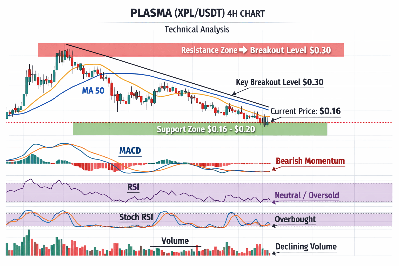 Na wyższych interwałach czasowych, Plasma Coin handluje w ramach przedłużonego trendu spadkowego, charakteryzującego się niższymi szczytami i dolnymi dołkami. Cena pozostała poniżej kluczowych średnich kroczących, takich jak 50-dniowa i 100-dniowa średnia krocząca, co wskazuje na presję spadkową w średnim okresie. Dopóki akcja cenowa nie odzyska tych poziomów z silnym wolumenem, momentum wzrostowe może pozostać ograniczone.