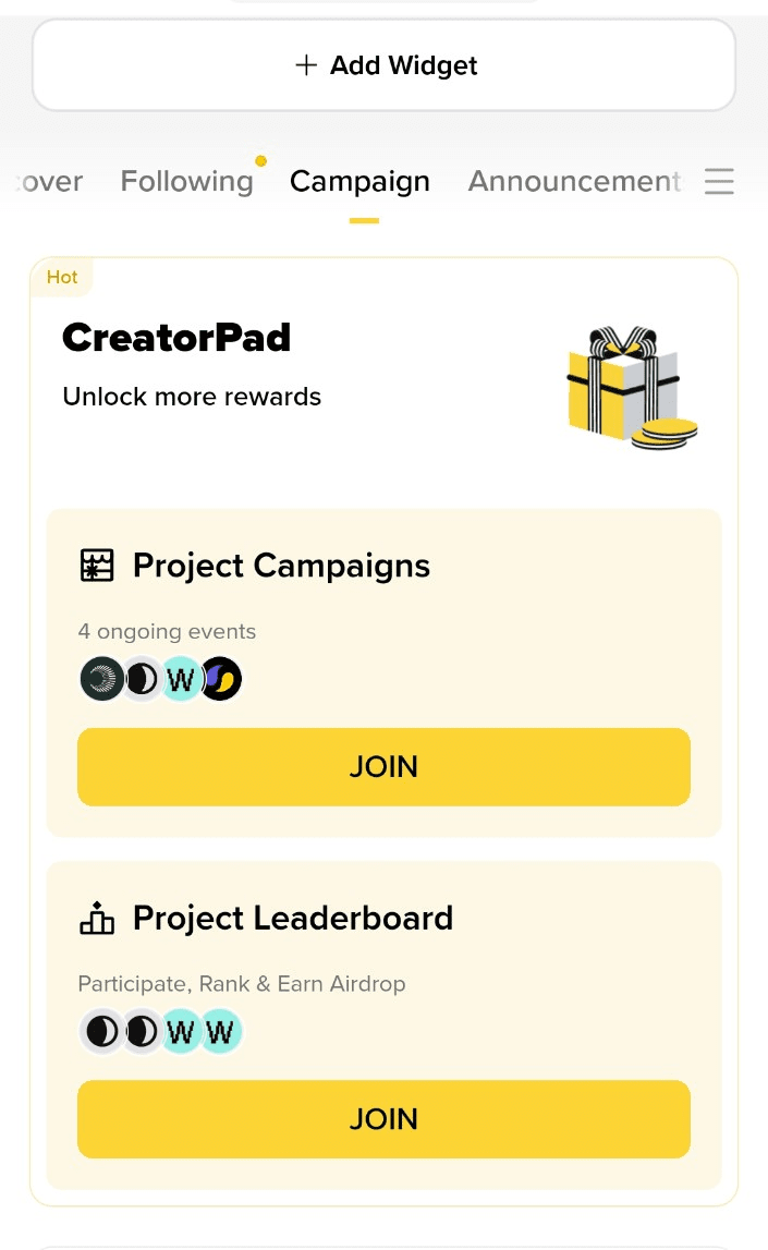 Po trzecie, kliknij Dołącz w wybranej kampanii. Gdy naciśniesz żółty przycisk „DOŁĄCZ”, zostaniesz oficjalnie zapisany. Niektóre kampanie mogą odblokować zadania natychmiast, podczas gdy inne wymagają dodatkowych kroków, takich jak połączenie portfela, powiązanie konta społecznościowego lub weryfikacja treści. Ukończ te kroki szybko, aby zapewnić sobie uprawnienia.