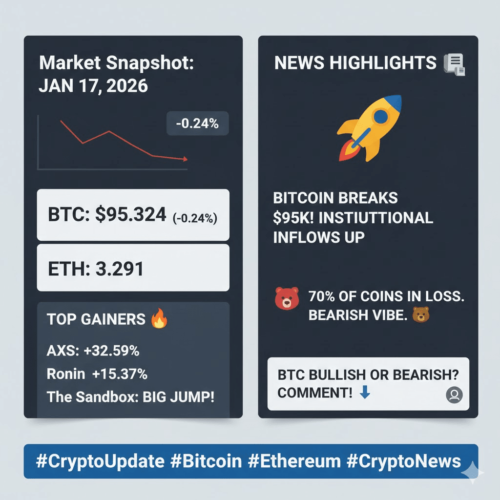 17 stycznia 2026: Rynek stabilny, ale nieco w dół (-0,24%). BTC utrzymuje się na poziomie 95 324 $, ETH 3 291 $.