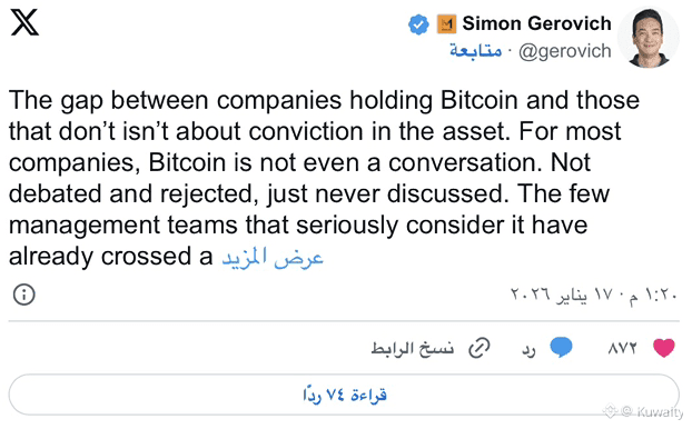 شارك سايمون جيروفيتش، الرئيس التنفيذي لشركة Metaplanet، رؤية واضحة حول تبنّي الشركات ل $BTC . وقال: «الفجوة بين الشركات التي تحتفظ ببيتكوين وتلك التي لا تفعل لا تتعلق بالقناعة بالأصل». وأضاف أن بيتكوين، بالنسبة لمعظم الشركات، لا تُطرح للنقاش أساساً. فهي لا تُناقَش في غرف مجالس الإدارة، ولا تُرفَض بعد تحليل، بل يتم تجاهلها.