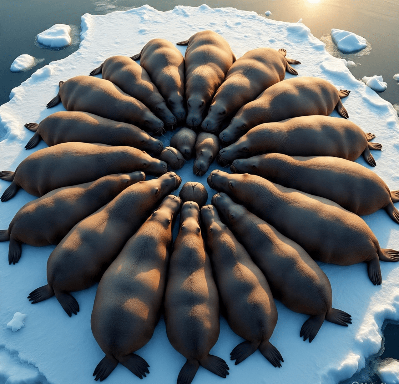 Samotny mors jest imponujący, ale prawdziwym spektaklem jest stado — rozległa, głośna, współzależna społeczność na lodzie. Tutaj archetyp @walrus ujawnia swoją drugą filar: inteligencję społeczności. Morsy są w ciągłej komunikacji, używając repertuaru stuknięć, kliknięć i ryków. Walczą o przestrzeń, a jednak ich przetrwanie zależy od bliskości.