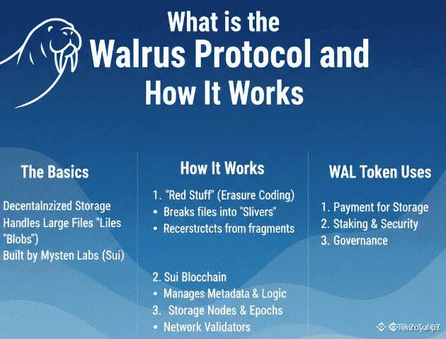 Walrus began as an attempt to solve a simple but stubborn problem: how to store very large, unstructured files videos, datasets, models, game assets in a way that is censorship resistant, affordable, and practical for real-world applications. Rather than trying to make every blockchain node hold a complete copy of every file, Walrus splits each file into encoded pieces and places those pieces across a network of independent storage nodes, while relying on the Sui blockchain as a lightweight control plane that manages discoverability, payments, node lifecycles and proofs of availability. This separation blobs for the heavy data and the blockchain for coordination is central to Walrus’s design and is what lets the system aim for both efficiency and strong fault tolerance.