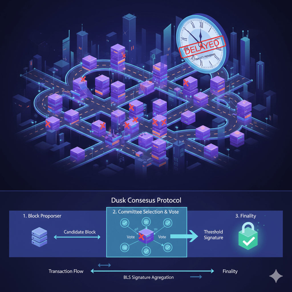 Dusk specjalizuje się w regulowanych operacjach finansowych, łącząc prywatność z efektywnością. Etapy protokołu konsensusu—wybór lidera, ślepe oferty i rundy zgody—zapewniają, że transakcje finalizują się szybko i przewidywalnie. Traderzy wiedzą dokładnie, kiedy blok jest potwierdzony i mogą działać bez wahania.