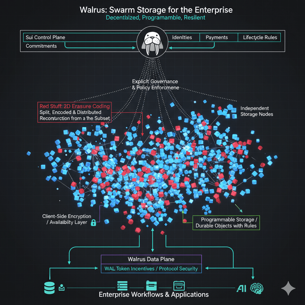 Przechowywanie danych w przedsiębiorstwie spędziło dwie dekady doskonaląc pocieszającą opowieść: umieść dane w niewielkiej liczbie zaufanych miejsc, otocz te miejsca kontrolami tożsamości i audytami, a następnie pozwól firmie działać szybko w przewidywalnym obszarze. Ta opowieść się rozpada w chwilach, które teraz definiują nowoczesne ryzyko — międzynarodowe zespoły pracujące pod sprzecznymi regulacjami, łańcuchy dostaw oprogramowania, które angażują dziesiątki dostawców, oraz przepływy danych AI, które przesuwają terabajty niestrukturalnych plików przez więcej narzędzi, niż zespół ds. bezpieczeństwa może realistycznie zmapować. Walrus jest interesujący, ponieważ nie próbuje bronić zamku mocniej. Zmienia geometrię miejsca, w którym „żyją” dane, przekształcając duże pliki w coś bliższego rójowi: rozdzielone, rozproszone, odzyskiwalne przez matematykę i regulowane przez wyraźne zasady, a nie milczące założenia dostawców.