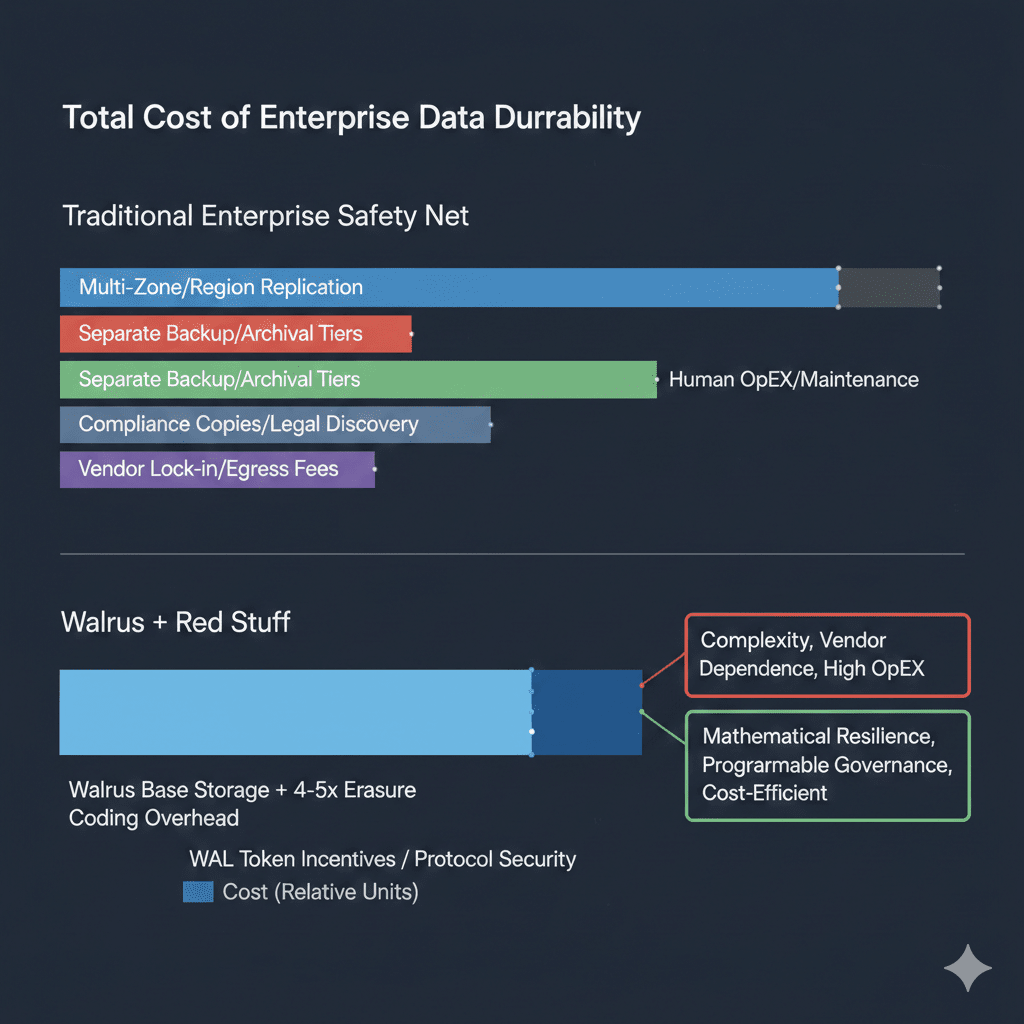 Właściwość odzyskiwania to to, gdzie Walrus staje się czytelny dla architektów przedsiębiorstw. Powszechne pytanie przedsiębiorstw nie brzmi „czy to jest zdecentralizowane”, lecz „co się dzieje o 3 rano, gdy coś się psuje?” Badania Walrusa twierdzą, że Czerwony Czynnik umożliwia samoodnowę bez centralnej koordynacji, a odporność można osiągnąć przy narzuceniu rzędu kilku wielokrotności oryginalnych danych, zamiast znacznie wyższych kosztów, które wynikają z prostej replikacji. W praktyce dokumenty Walrusa i związane z nimi materiały techniczne opisują narzuty w zakresie od czterech do pięciu razy dla przechowywania blobów z odpornością, co jest dramatyczne, ponieważ zdecentralizowane przechowywanie historycznie płaciło za trwałość siłą. Pięć razy brzmi drogo, dopóki nie przypomnisz sobie, co przedsiębiorstwa już robią, gdy traktują trwałość poważnie: replikacja w wielu strefach, redundancja między regionami, oddzielne poziomy backupu, oddzielni dostawcy archiwów i rosnący labirynt kopii zgodności. Rzeczywistym porównaniem nie jest „Walrus kontra jeden kubełek S3.” Rzeczywistym porównaniem jest „Walrus kontra całkowity koszt siatki bezpieczeństwa przedsiębiorstwa”, w tym koszt pracy ludzkiej potrzebnej do jej utrzymania.