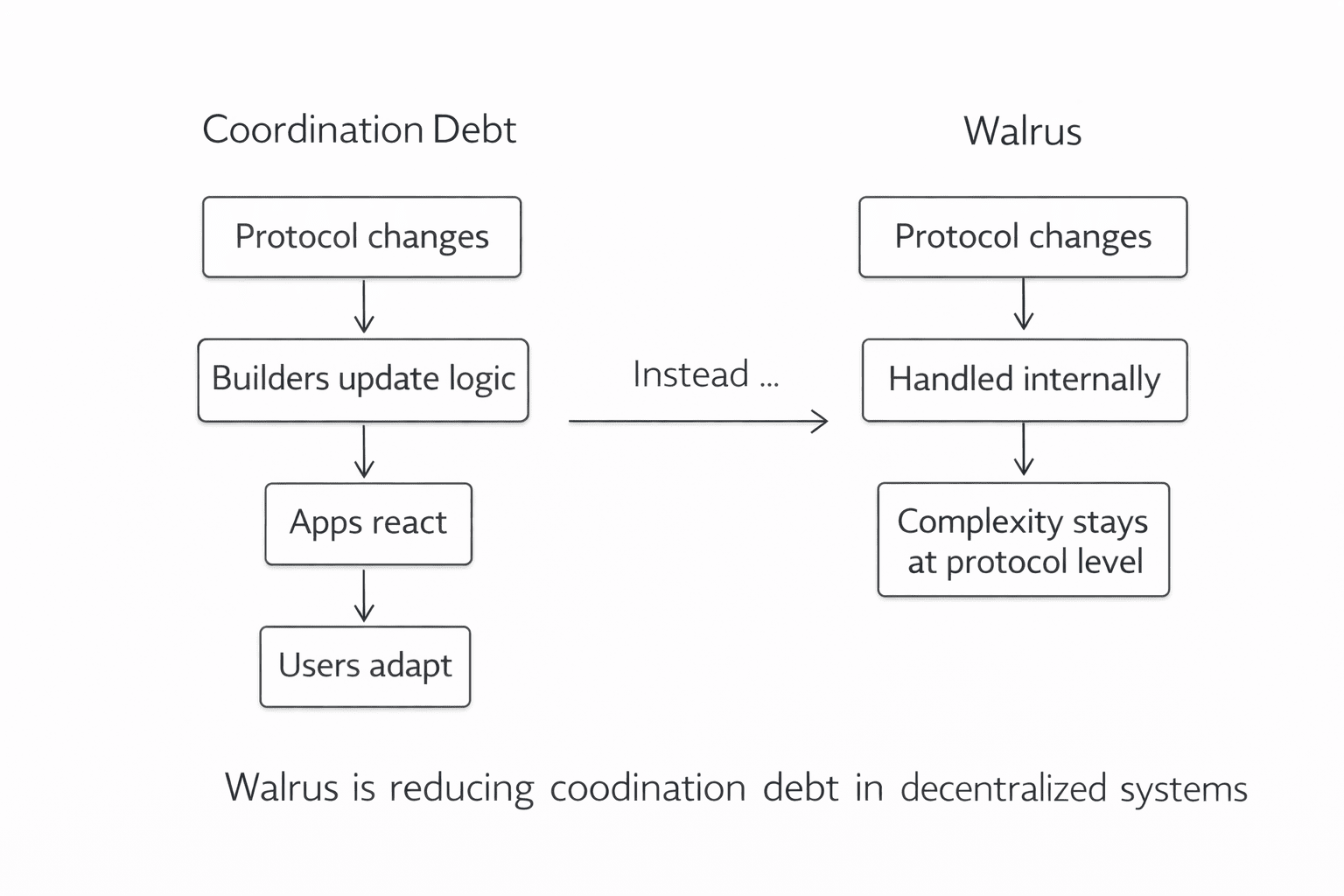 W wielu sieciach każda aktualizacja, zmiana parametru czy wewnętrzna korekta powoli przesuwa odpowiedzialność na zewnątrz. Budowniczy muszą aktualizować logikę. Aplikacje muszą reagować. Użytkownicy są zmuszeni do adaptacji, nawet gdy dla nich nic nie jest zepsute. Walrus przyjmuje inne stanowisko. Zamiast przesuwać zmiany na obrzeża, Walrus absorbuje złożoność na poziomie protokołu. Zmiany wewnętrzne są obsługiwane przez sam system, a nie przekazywane aplikacjom czy użytkownikom.