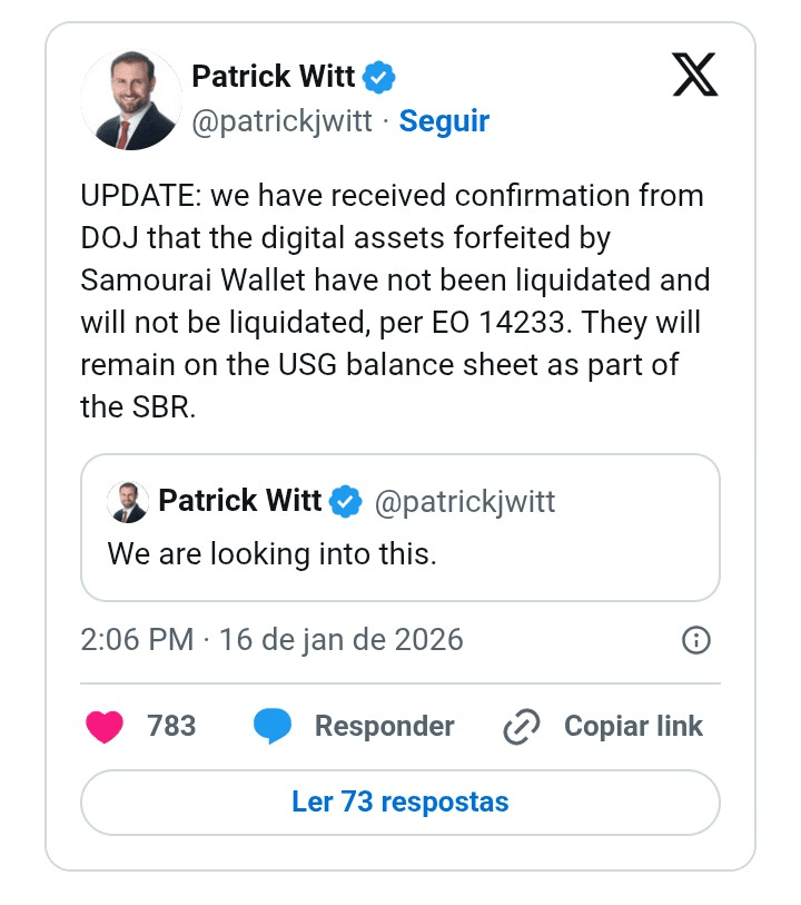 Uai, sô… Prawie sześć milionów czterysta tysięcy dolarów w Bitcoin, które ludzie tam w Stanach Zjednoczonych zabrali twórcom wspomnianej Samourai Wallet, nie zostały sprzedane. Zamiast tego trafią do krajowej rezerwy Bitcoin, jak powiedział pracownik Białego Domu w piątek, 16.