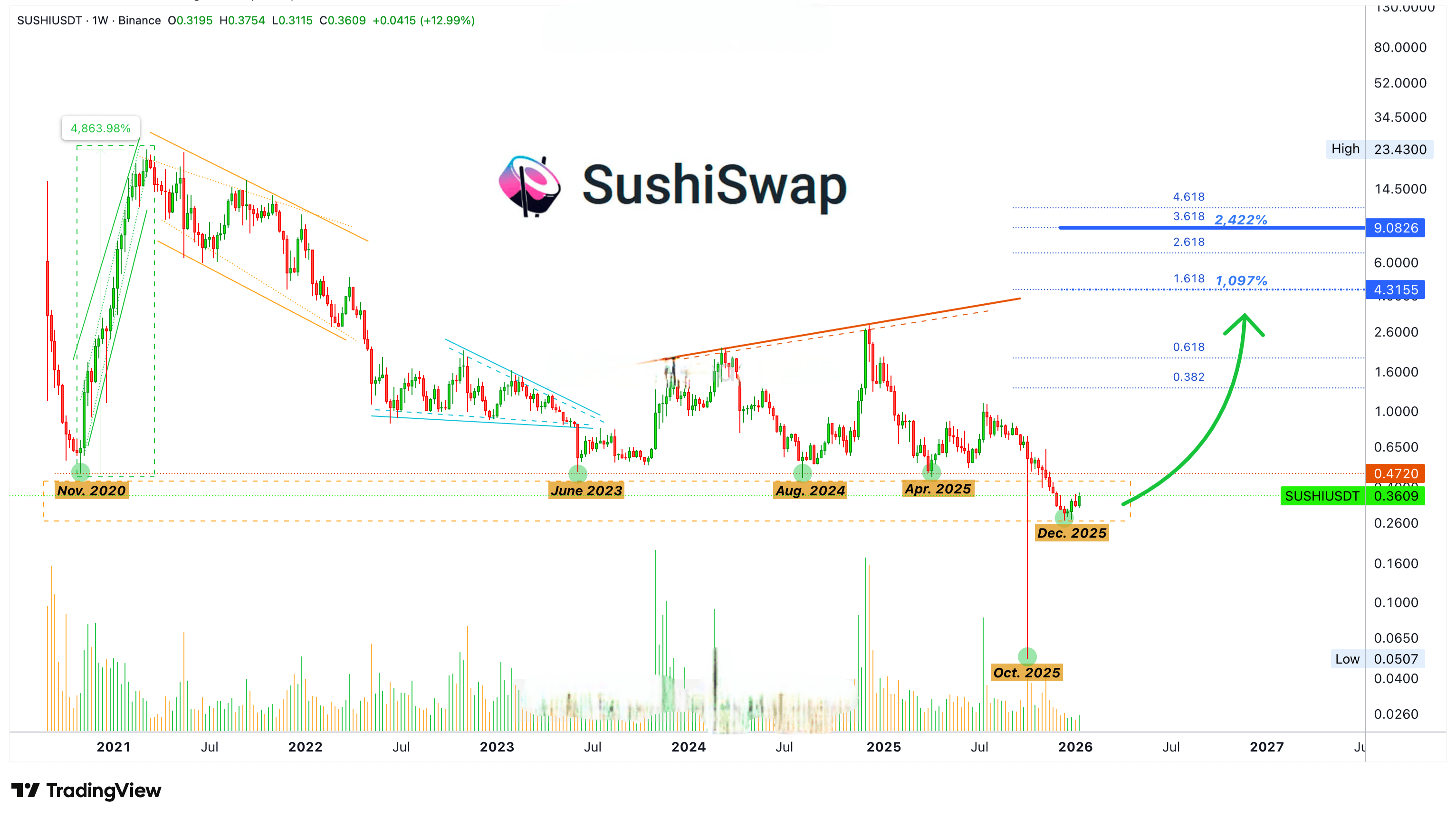 Rozważmy teraz długoterminowy wykres dla SushiSwap.