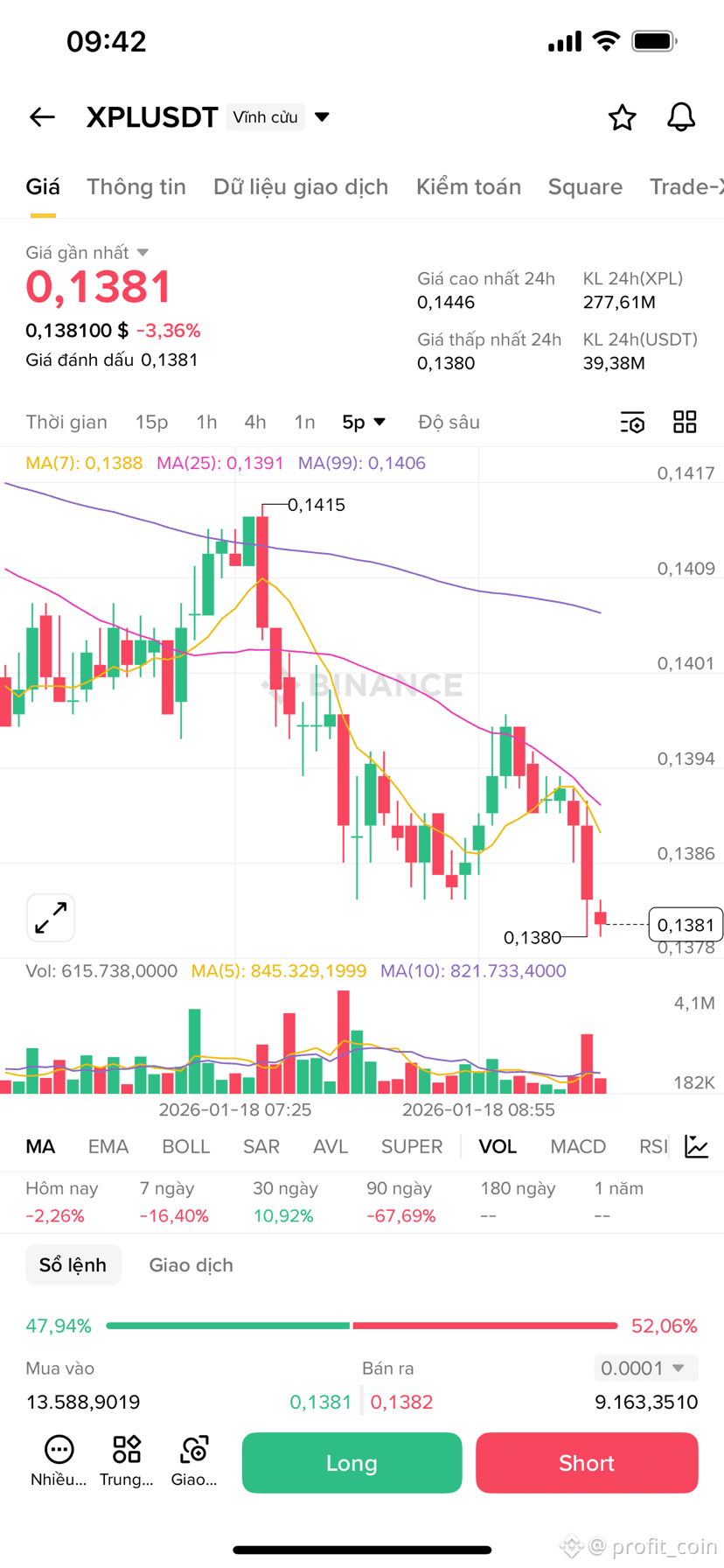 从当前的 XPLUSDT 行情结构来看,价格在前期上涨至 0.1415 一线后出现明显回调,短期均线开始走弱,市场进入技术性调整阶段。目前价格回落至 0.1380 附近,这是前期多次形成支撑的重要区域,也是多空分歧较大的位置。