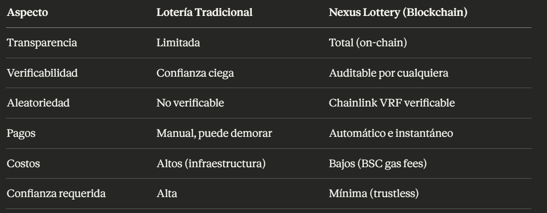 Nexus Lottery to zdecentralizowana aplikacja (DApp) loterii zbudowana na Binance Smart Chain, która wykorzystuje zweryfikowane inteligentne kontrakty oraz Chainlink VRF, aby zapewnić demonstracyjnie uczciwe losowania.