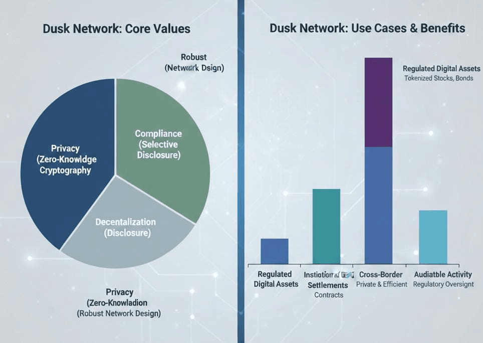 Dusk nie ma na celu obalenia tradycyjnych finansów z dnia na dzień. Zamiast tego zapewnia odpowiedzialną ścieżkę, aby wprowadzić blockchain do regulowanych rynków.