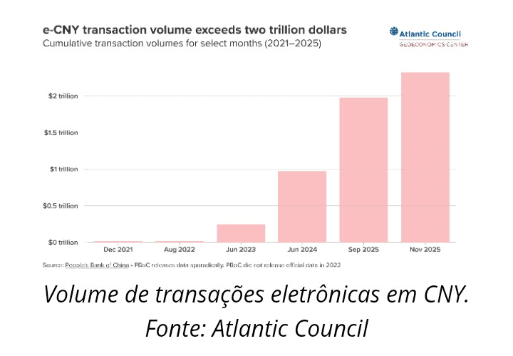 O tal do mBridge, que é moeda digital de banco central (CBDC), já fechou mais de 4 mil operações internacionais, somando coisa de US$ 55,5 bilhões, segundo dado do pessoal do Atlantic Council lá de Washington. Pra ter ideia, isso cresceu quase 2.500 vezes desde que começou em 2022.