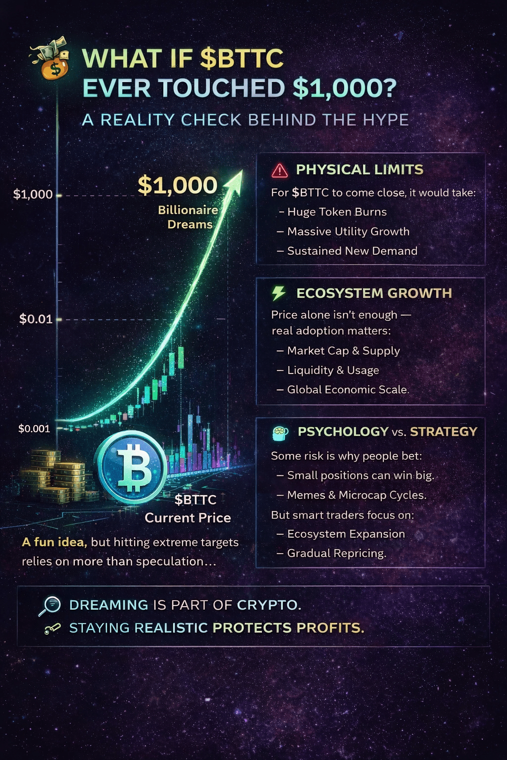Pomysł jest na tyle szalony, że przyciągnie uwagę każdego. Jeśli $BTTC kiedykolwiek osiągnie 1 000 dolarów za token, nawet małe torby byłyby warte więcej niż większość ludzi zarabia w ciągu życia. To rodzaj eksperymentu myślowego, który napędza marzenia o kryptowalutach, scenariusze wczesnej emerytury i klasyczne myślenie "trzymaj dłużej i wygrywaj wielkie".