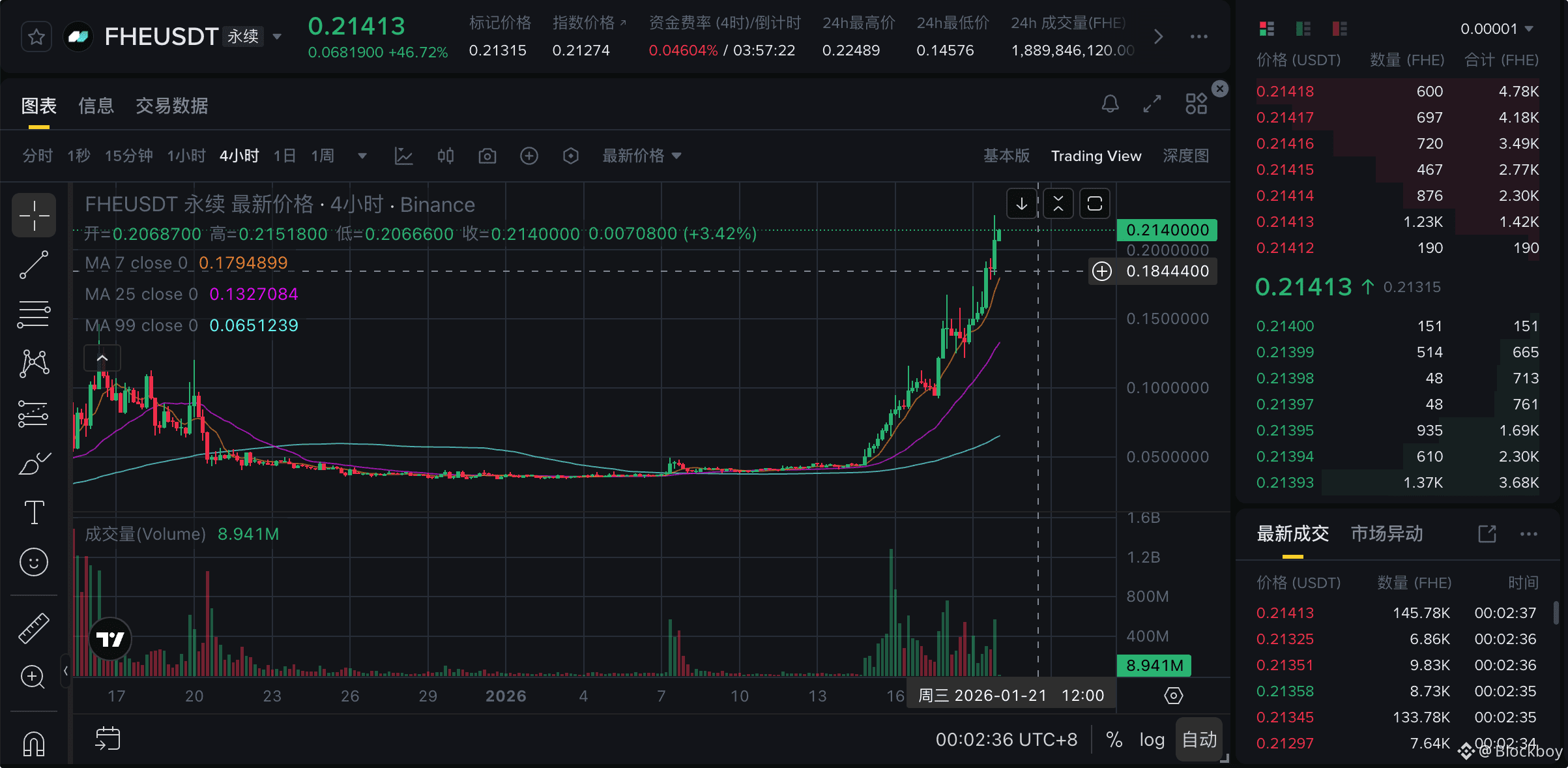 目前 $FHE 正处于一个非常典型的 “情绪+技术”双重共振的爆发期 。结合当前Binance的量价走势图以及当前的社交媒体/新闻面(截至 2026 年 1 月 19 日),以下是详细的走势分析: