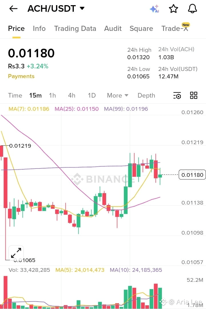 $ACH stabilizuje się po ostrym wyprzedaży w strefie płynności 0.0106, po czym nastąpił kontrolowany odbicie. Cena obecnie konsoliduje się wokół odzyskanych średnich krótko-terminowych, co sugeruje, że rynek próbuje zbudować bazę, a nie kontynuować spadki.