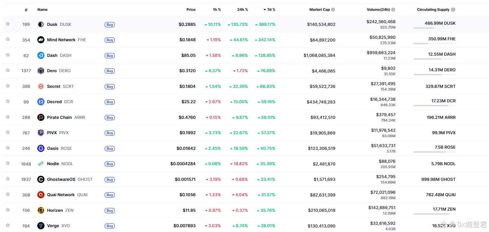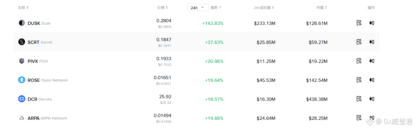 在整体市场回调背景下,隐私币展现出极强抗跌性与爆发力,龙头及潜力币种表现亮眼: