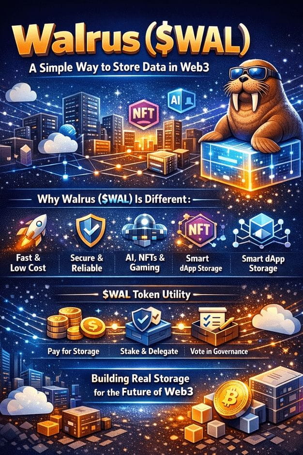 Walrus zaczyna przypominać jeden z tych projektów, które rośnie w cichy, ale niezaprzeczalny sposób, nie dlatego, że krzyczy o uwagę, ale dlatego, że rozwiązuje problem, który ciągle się pojawia, gdy ludzie próbują zbudować coś prawdziwego na blockchainie, którym jest problem, gdzie rzeczywiste dane się znajdują. Kiedy patrzysz na kierunek, w którym zmierza przestrzeń, staje się jasne, dlaczego energia społeczności wokół zdecentralizowanego przechowywania rośnie, ponieważ następna fala aplikacji to nie tylko transakcje, to treści, media, pliki AI, zasoby gier, dowody i rejestry, a jeśli wszystko to nadal zależy od jednego dostawcy chmury, to obietnica własności zawsze ma słaby punkt. Walrus jest zbudowany na Sui i koncentruje się na zdecentralizowanym przechowywaniu blobów, wykorzystując kodowanie erasure do dzielenia dużych plików na części, które można rozprowadzać po wielu węzłach i nadal odzyskiwać, nawet jeśli niektóre węzły przestaną działać, a ten projekt wydaje się stworzony dla budowniczych, którzy są zmęczeni kruchą infrastrukturą i chcą czegoś, na czym mogą polegać, gdy użycie rośnie, a warunki stają się niedoskonałe.