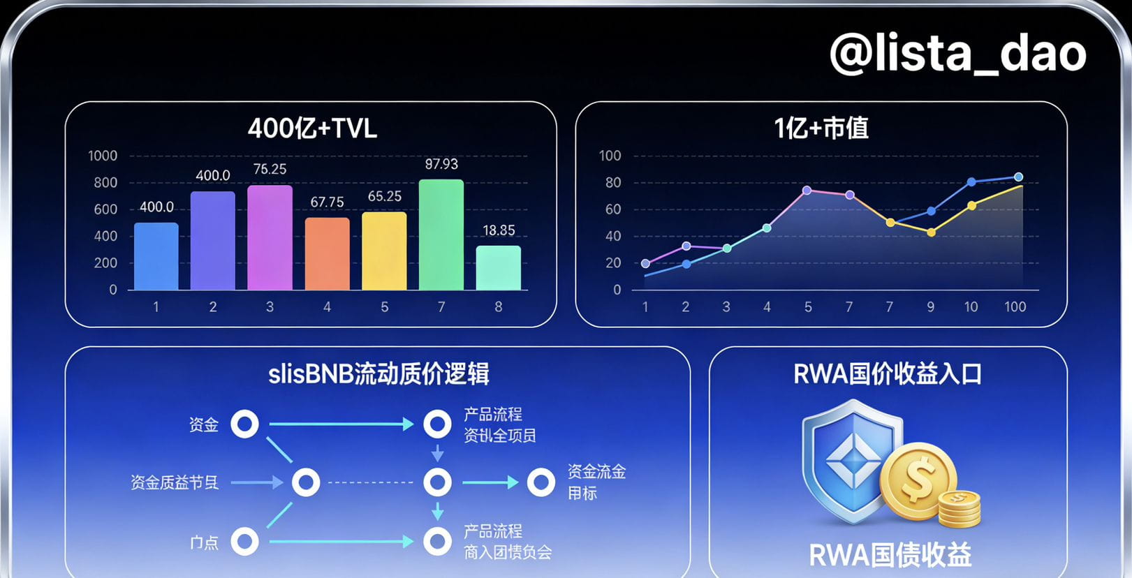 它的核心逻辑很清晰:你存BNB,它给你一个流动的质押凭证(slisBNB),然后你还能用它抵押借出USD1去别处挖矿赚收益。利息低,流程顺,形成了闭环。最近搞的RWA(现实世界资产)板块,让存USDT赚国债收益,也是个吸引增量资金的故事。