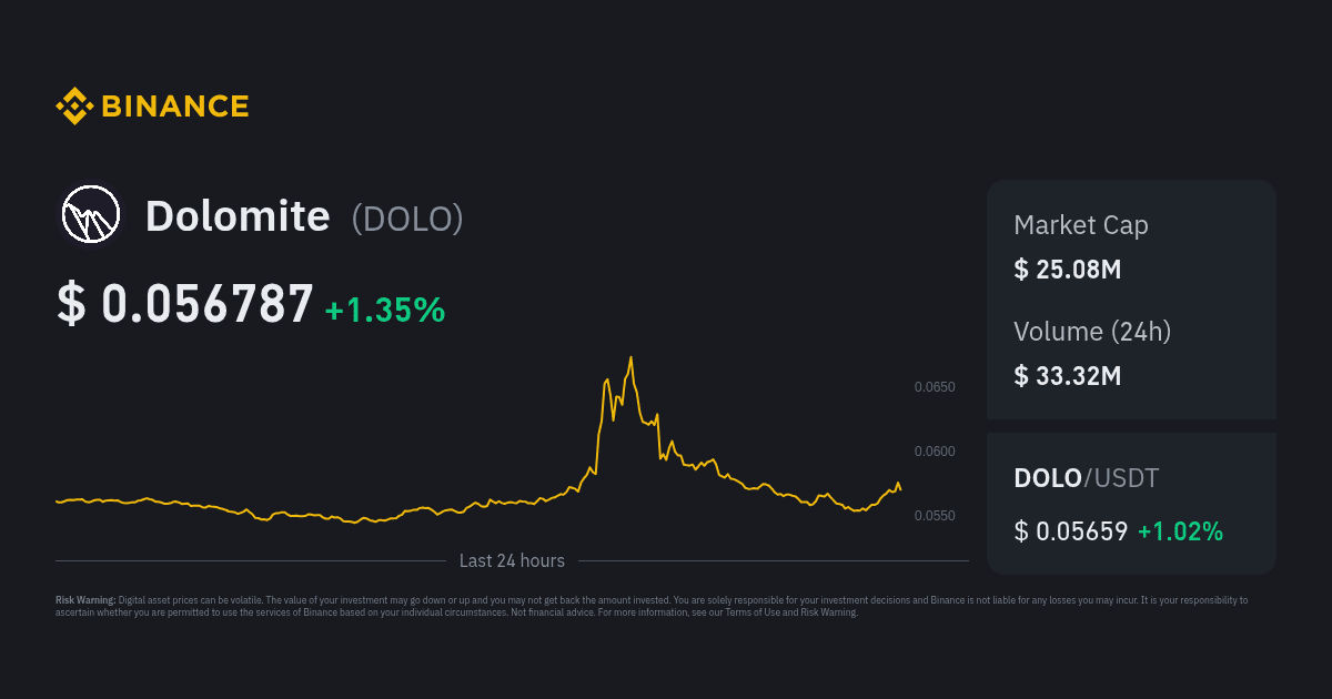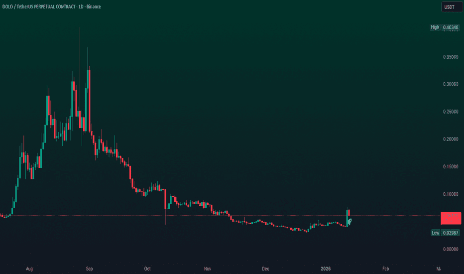 $DOLO handluje w pobliżu ~$0.055–$0.07 USD na głównych platformach takich jak Binance & CoinMarketCap. Ostatnie ruchy cenowe pokazują trend spadkowy od wcześniejszych wzrostów, przy czym token obecnie waha się w stosunkowo niskim zakresie po przedłużonej korekcie. ([Binance][1])