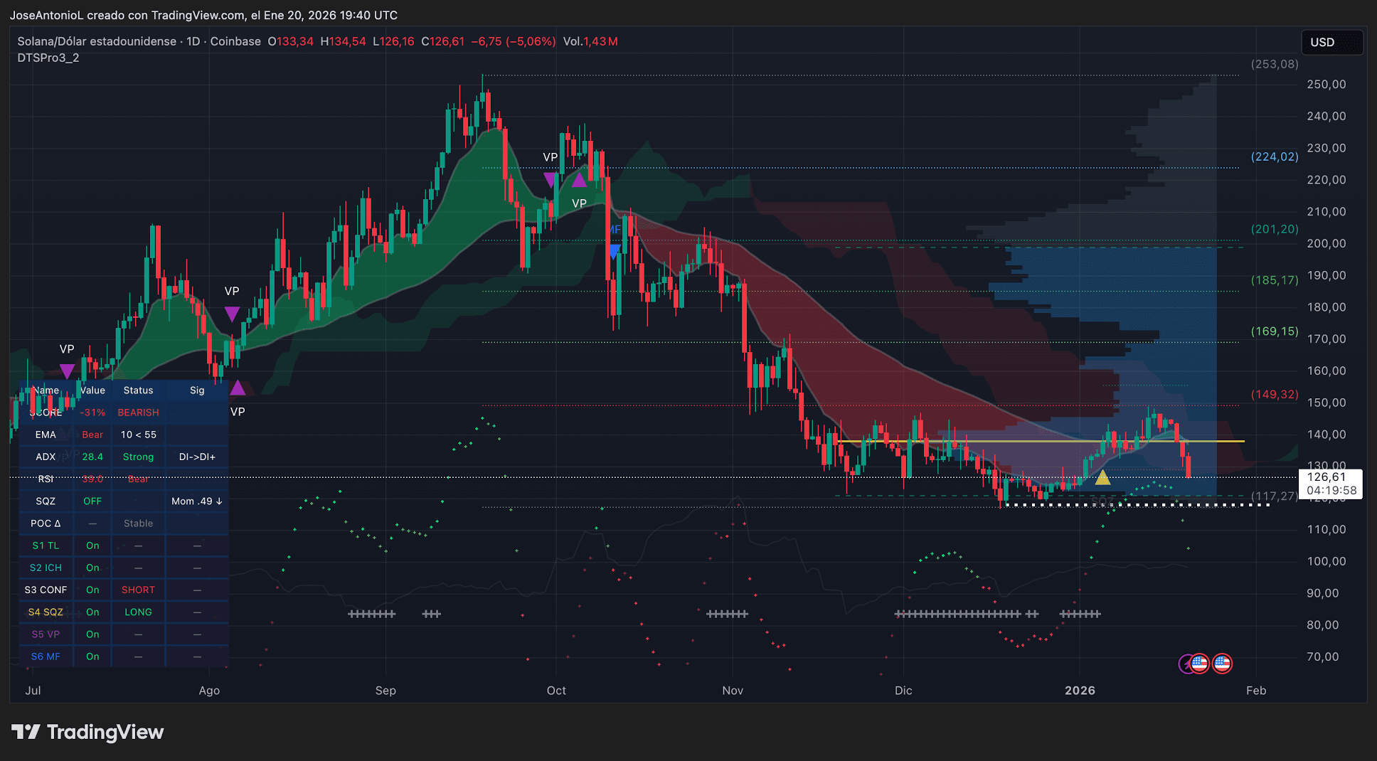 $SOL Solana podąża za przykładem Bitcoina, spadając o 5,06% do 126,61 USD. Poniższy wykres pokazuje, że SOL również przeciął swoją 200-dniową EMA z autorytetem, a wskaźniki techniczne sygnalizują niedźwiedzią tendencję na całej linii.