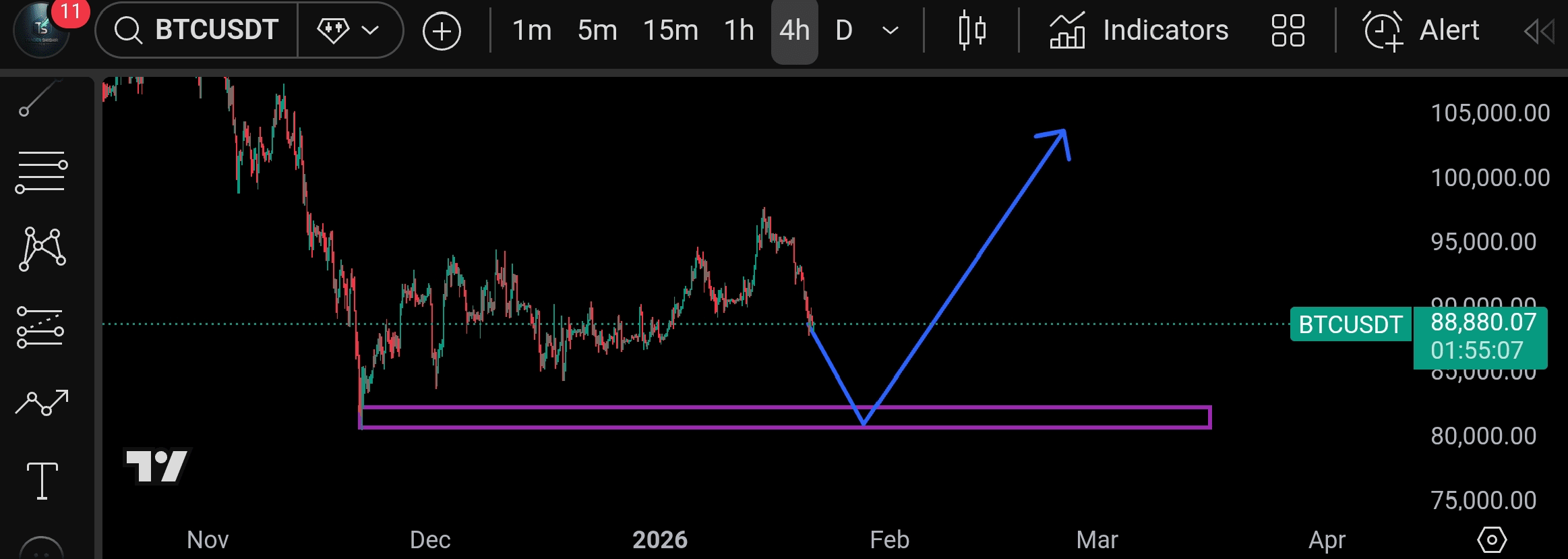 Cena BTC zbliża się do strefy płynności / popytu na wysokim interwale czasowym.