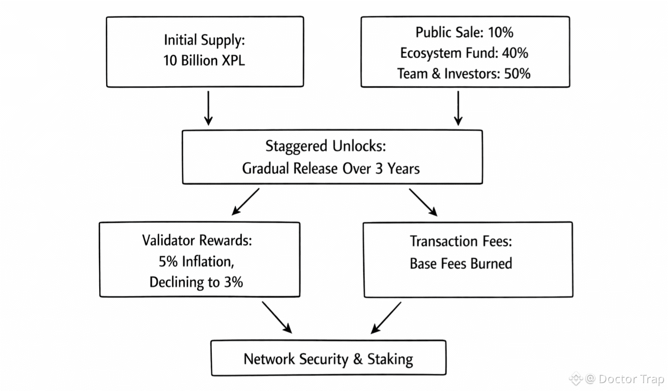 The total supply at mainnet beta sits at 10 billion XPL. Ten percent was allocated to the public sale, forty percent reserved for ecosystem growth, and the remaining half split evenly between the team and early investors. To me, this balance reads like a practical compromise rather than a marketing trick. Networks fail when ownership tilts too far in either direction. Too much insider weight starves the ecosystem. Too little long-term alignment drains accountability. I have watched both happen.
