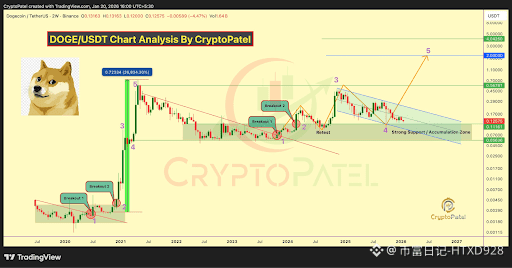 根据 Crypto Patel 在 X 上分享的一份最新技术分析,狗狗币自 2021 年峰值以来仍在经历多年的回调,目前在高时间框架内处于一个清晰的积累区间。该分析师指出,如果重要的支撑位能够继续保持有效,那么这一阶段可能正在为第五波宏观扩张奠定基础,推动狗狗币创下新的价格新高。