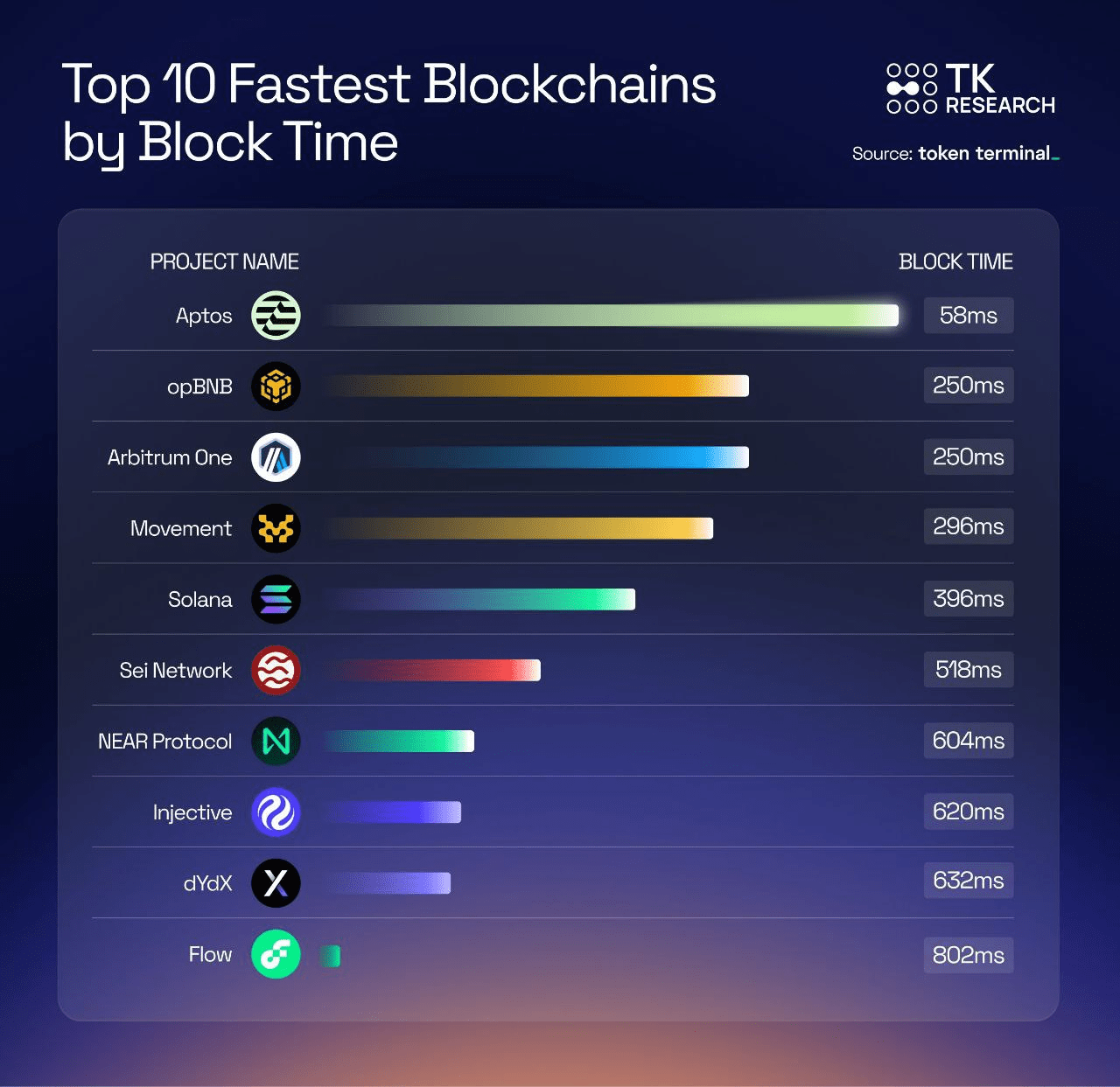 Na podstawie ostatnich danych z Token Terminal i benchmarków ekosystemu, oto 10 najszybszych liderów czasu bloków, którzy przekształcają wydajność blockchaina 👇