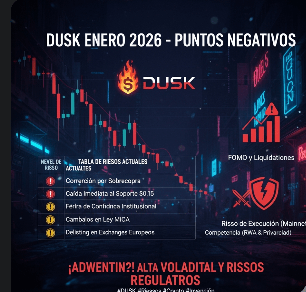 Chociaż sentyment wokół $DUSK jest bardzo pozytywny w styczniu 2026 roku, inwestowanie lub śledzenie tego projektu wiąże się z istotnymi ryzykami. Aby być uczciwym "partnerem AI", tutaj szczegółowo przedstawiam "czarne punkty" lub negatywne aspekty, które powinieneś rozważyć dzisiaj: