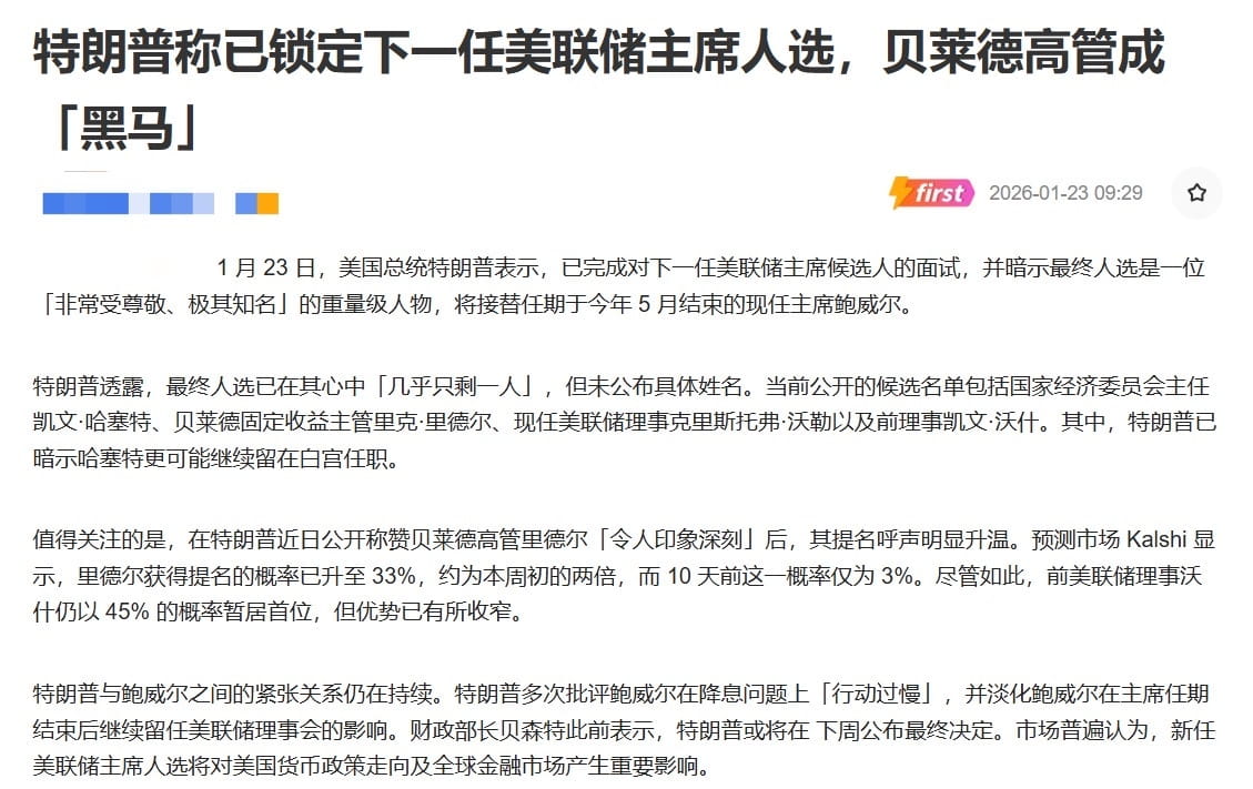 Najpierw powiem o „wietrze” z rynku zewnętrznego. Najważniejsza sprawa to to, że były prezydent Trump ogłosił, że już „zablokował” kandydata na nowego przewodniczącego Fed. Rick Riedel z BlackRock stał się czarnym koniem, a prognozy rynkowe pokazują, że jego prawdopodobieństwo nominacji wzrosło z jednocyfrowych do blisko jednej trzeciej w ciągu kilku dni.