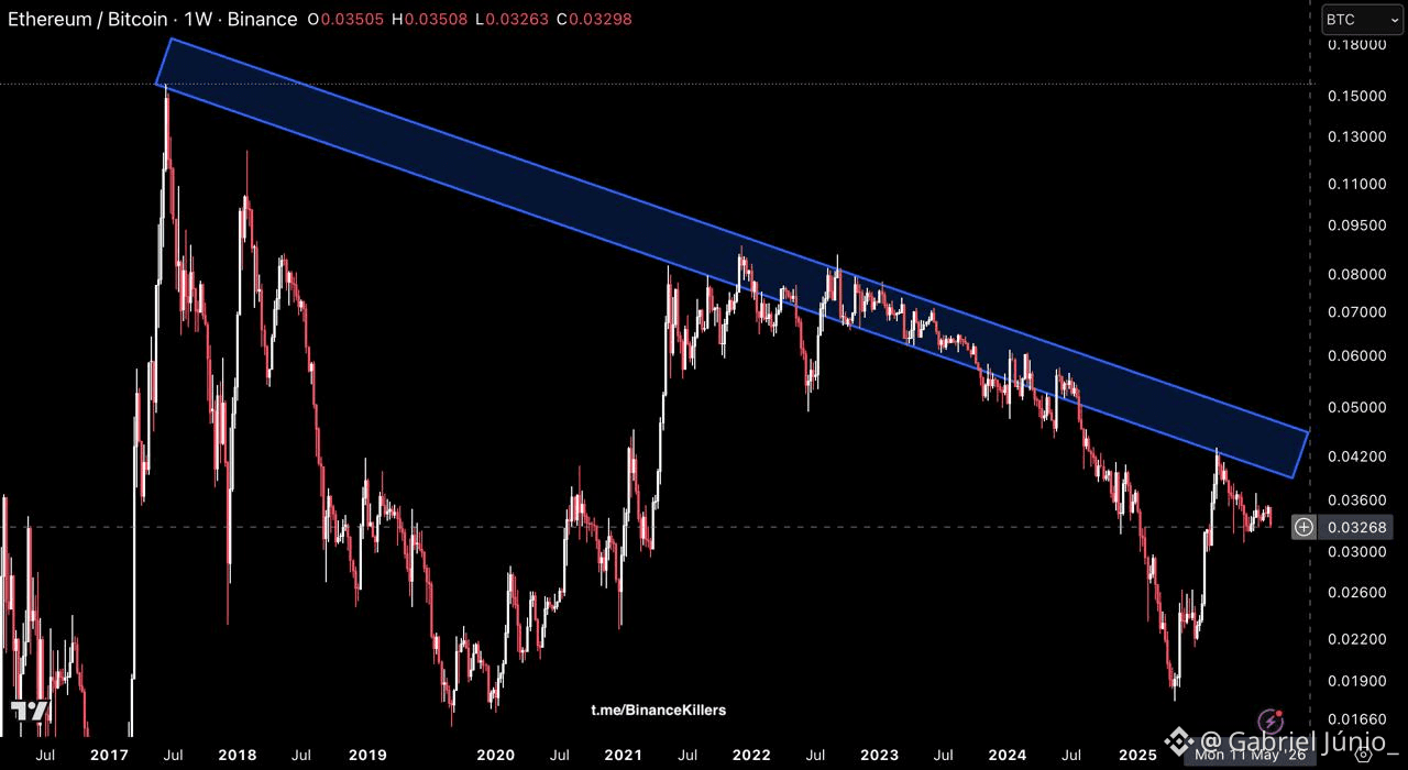 Uma quebra confirmada e sustentada acima dessa linha de tendência marcaria uma mudança estrutural a favor do ETH e das altcoins. Até que isso aconteça, essa zona continua sendo uma resistência, não uma confirmação.