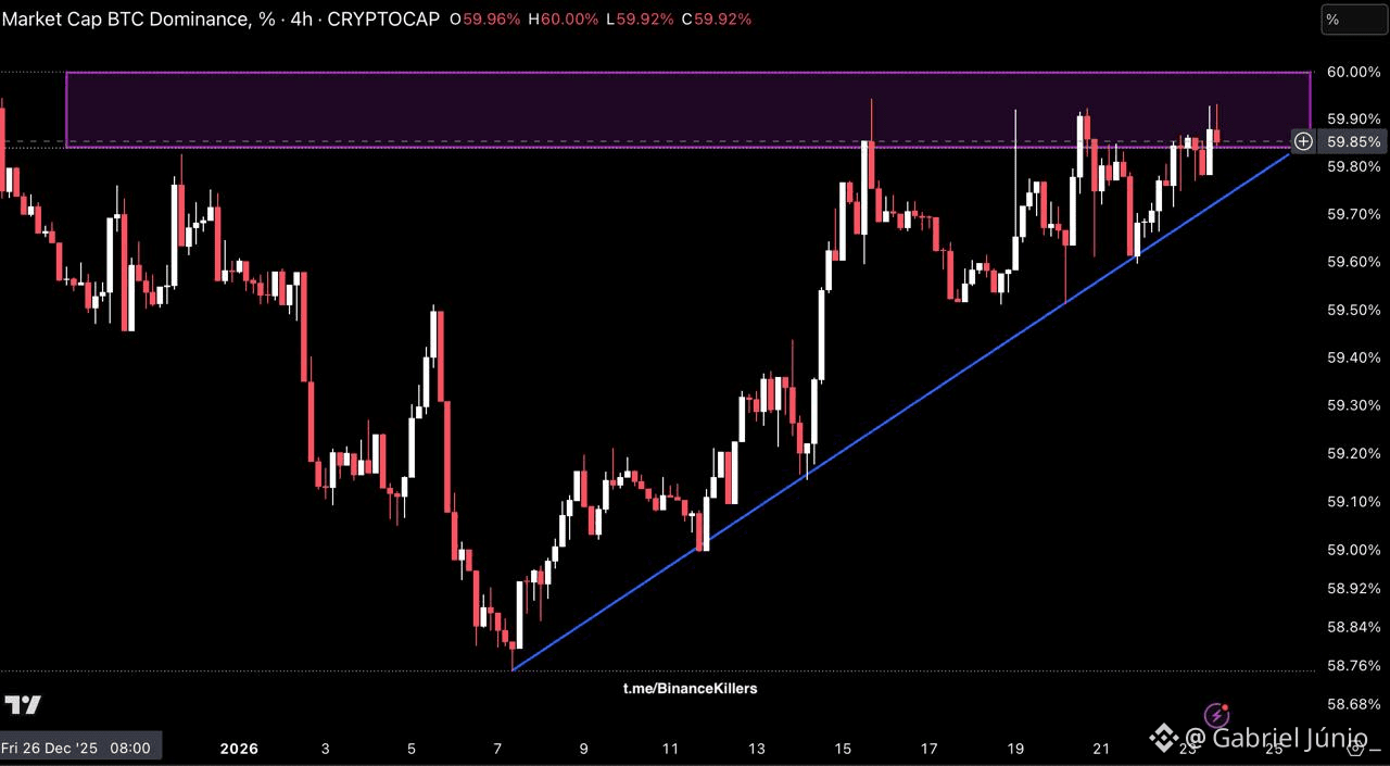 Enquanto a dominância permanecer abaixo de 60%, o potencial de alta do BTC segue limitado e o risco de rotação para as altcoins continua presente. A condição principal permanece a mesma: é necessário um fechamento diário abaixo de 58,5% para confirmação. Até lá, o cenário segue condicional — favorecendo novamente as altcoins
