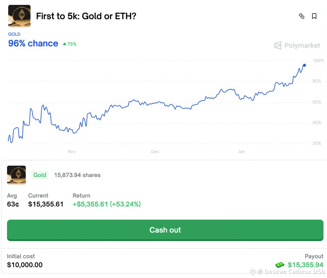 I told you that Gold will reach $5000 mark faster than Ethereum back in 18 December 2025 when Gold was $4300. Polymarket chances were 62%.
