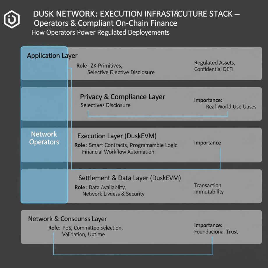 Architektura Dusk została zaprojektowana w taki sposób, aby prymitywy prywatności i zgodności były osadzone na poziomie protokołu, a operatorzy utrzymywali integralność techniczną sieci, gdy przetwarzane są rzeczywiste regulowane aktywa i poufne inteligentne kontrakty. To odrębna rola od zarządzania — operatorzy koncentrują się na ciągłości technicznej i wykonaniu protokołu.