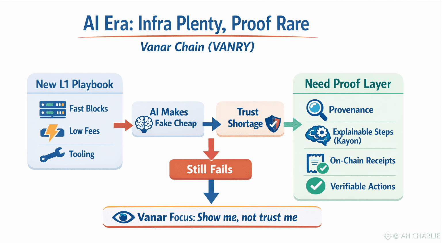 I was scrolling through another “new L1” post last week, half awake, thumb doing the work. Same promise. Faster blocks. More apps. Big plans for “AI.” Then I hit a line about @Vanarchain (VANRY) and I stopped, because it wasn’t selling more roads. It was talking about receipts. Proof. The kind of proof you can hold up and say, “See? This happened. In this way. At this time.” And it made me realize why so many fresh chains feel loud at launch… then quiet later. In an AI era, we don’t have an infra shortage. We have a trust shortage. We have plenty of pipes. But clean proof is rare.