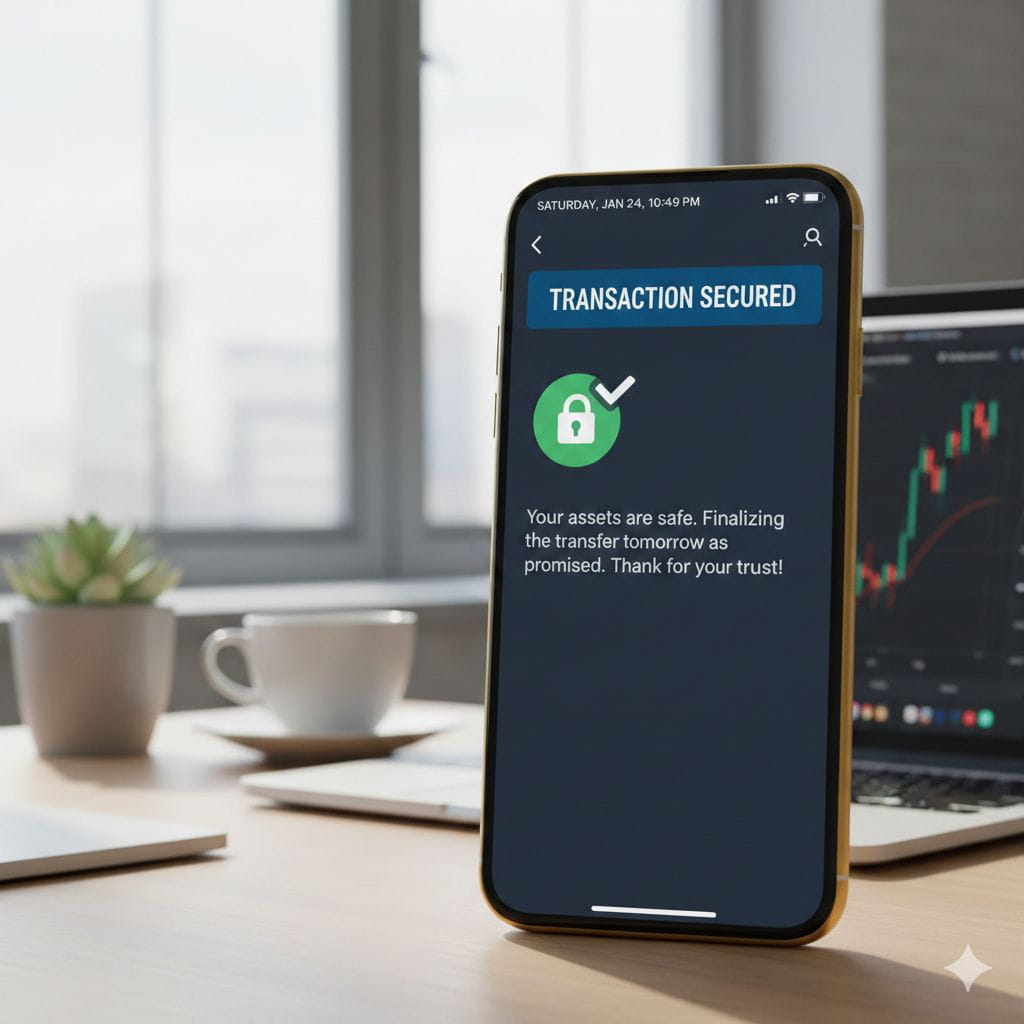 "Assets are safe. Finalizing the transaction tomorrow as promised. Appreciate your trust!"