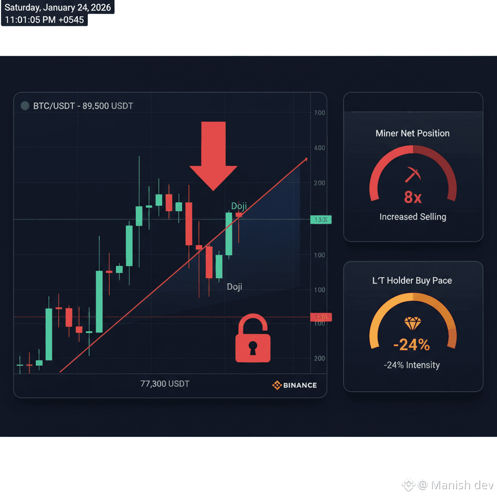 Would you like me to generate a "Warning/Technical Analysis" style image to go with this post?Bitcoin looks steady at $89,500, but don’t let the silence fool you. Under the surface, the "Doji" candles on the chart aren't showing balance—they’re showing doubt.
