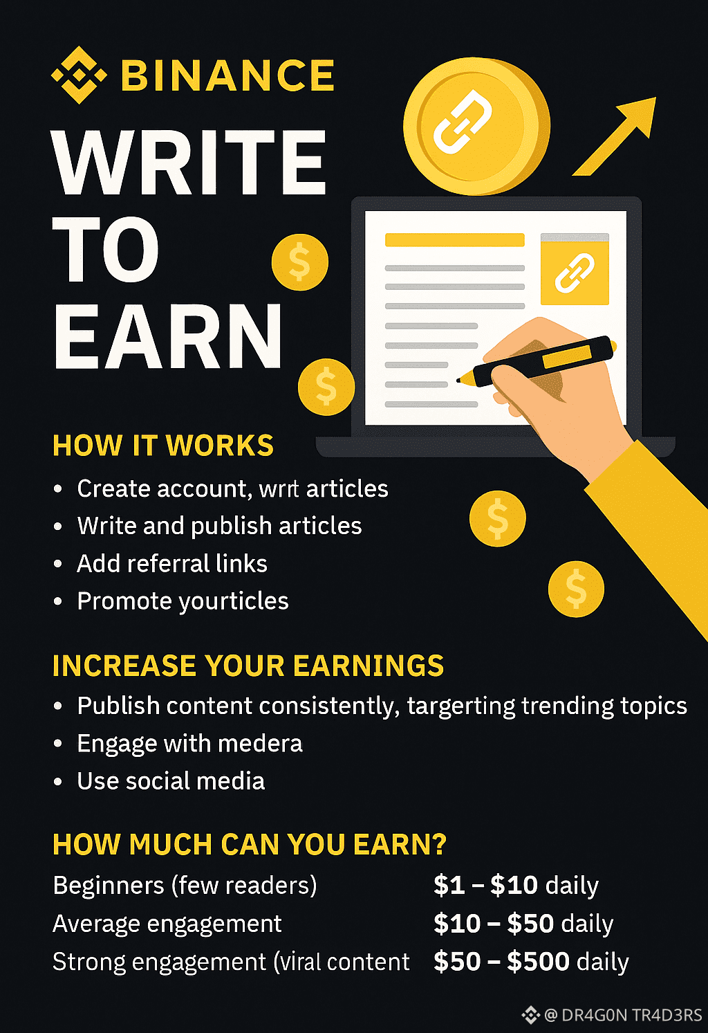 Write to Earn is a concept where creators, analysts, and crypto enthusiasts earn rewards by writing high-quality content related to cryptocurrency, blockchain, trading, and Binance’s ecosystem.