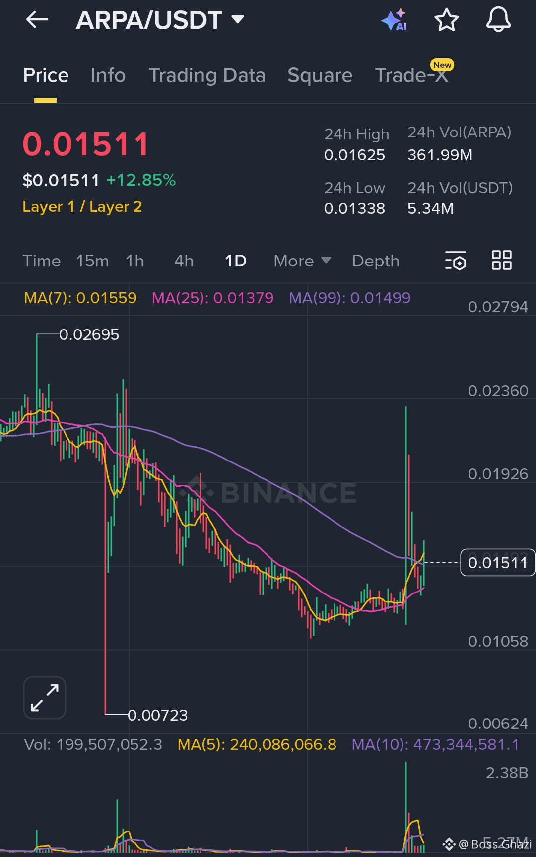 ARPA is currently sitting on a "Make or Break" level at 0.0150. If it holds this level, it can recover towards $0.018. If it loses this level, it will likely drop back to $0.0138