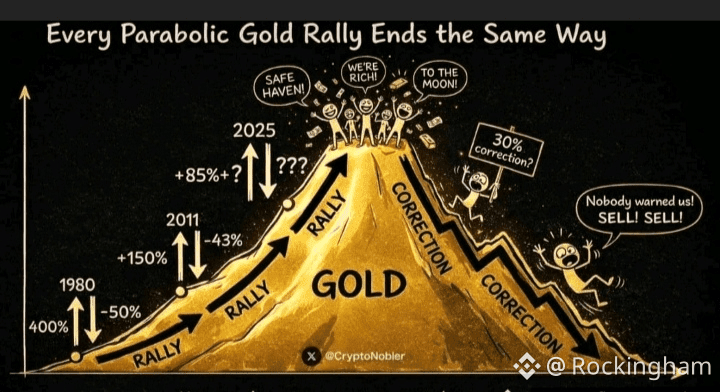 🚨 #GOLD MAY CRASH THE GLOBAL MARKET NEXT WEEK! Gold surged 85% in 12 months — and that’s dangerous. When gold goes parabolic, history shows it eventually corrects hard. Past Parabolic Gold Tops 1980 • Gold peaked near $850 • Then dumped 40–60% • Took years to recover 2011 • Gold peaked near $1,920 • Fell ~43% over the next years 2020 • Gold topped $2,075 • Corrected 20–25% and then consolidated The Pattern is Clear After 60–85% rallies, gold typically: • Corrects 20–40% • Moves sideways for years • Resets the market 📌 Gold is a long-term hedge — not a straight-line asset. Parabolic rallies invite leverage and FOMO, and those are the moments that end badly. The biggest mistake: believing the rally is permanent. History says the opposite. $XAU ⚠️
