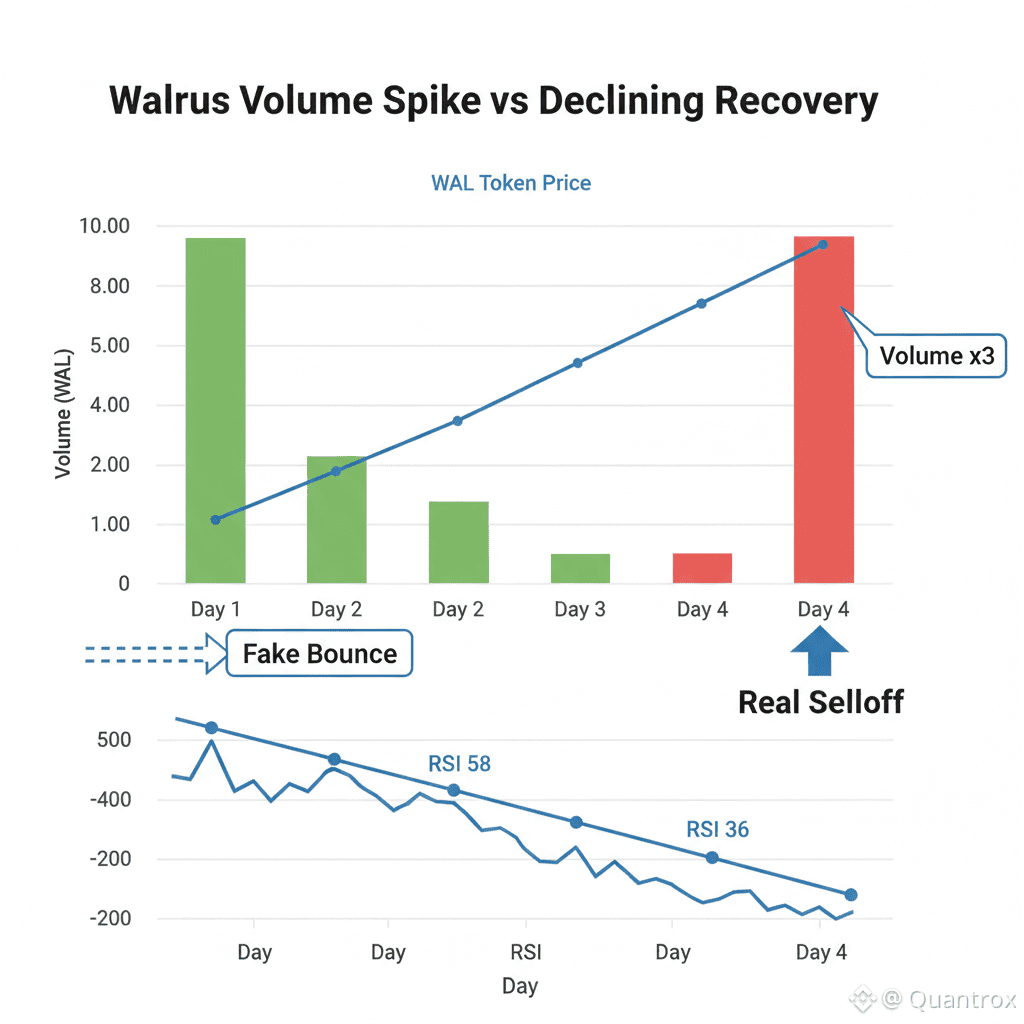 Here's what makes this volume spike particularly meaningful. It broke the pattern. For days, volume had been declining steadily. Markets don't bottom on declining volume—they bottom on volume spikes that exhaust sellers. Walrus hasn't had that volume spike at the lows. Instead, volume spiked during a move down. That's continuation pattern, not reversal.