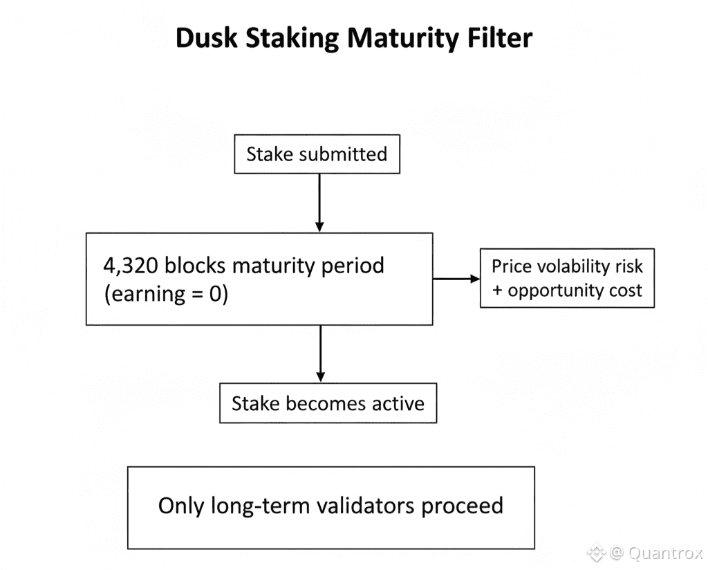 When I found out Dusk makes you wait 4,320 blocks before your stake even becomes active, I thought that was suicide for validator growth. Two full epochs sitting there earning zero while watching price potentially move against you? Nobody accepts that friction when Ethereum lets you start earning within hours, Solana within epochs that last two days. Why would anyone choose Dusk knowing they're forfeiting weeks of potential rewards just to participate?