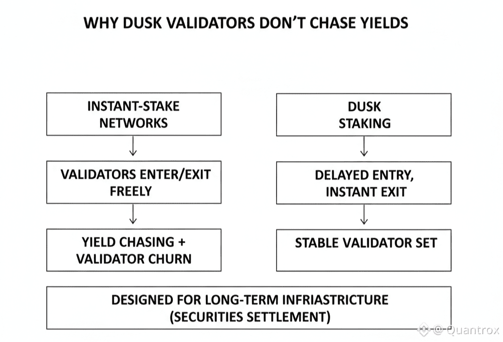 That forced stability is exactly what you'd want if Dusk is building securities settlement infrastructure. You can't process regulated financial transactions on a network where validators are constantly churning in and out based on which way price moved today. Settlement finality needs stable consensus from operators who aren't disappearing when APY drops temporarily.
