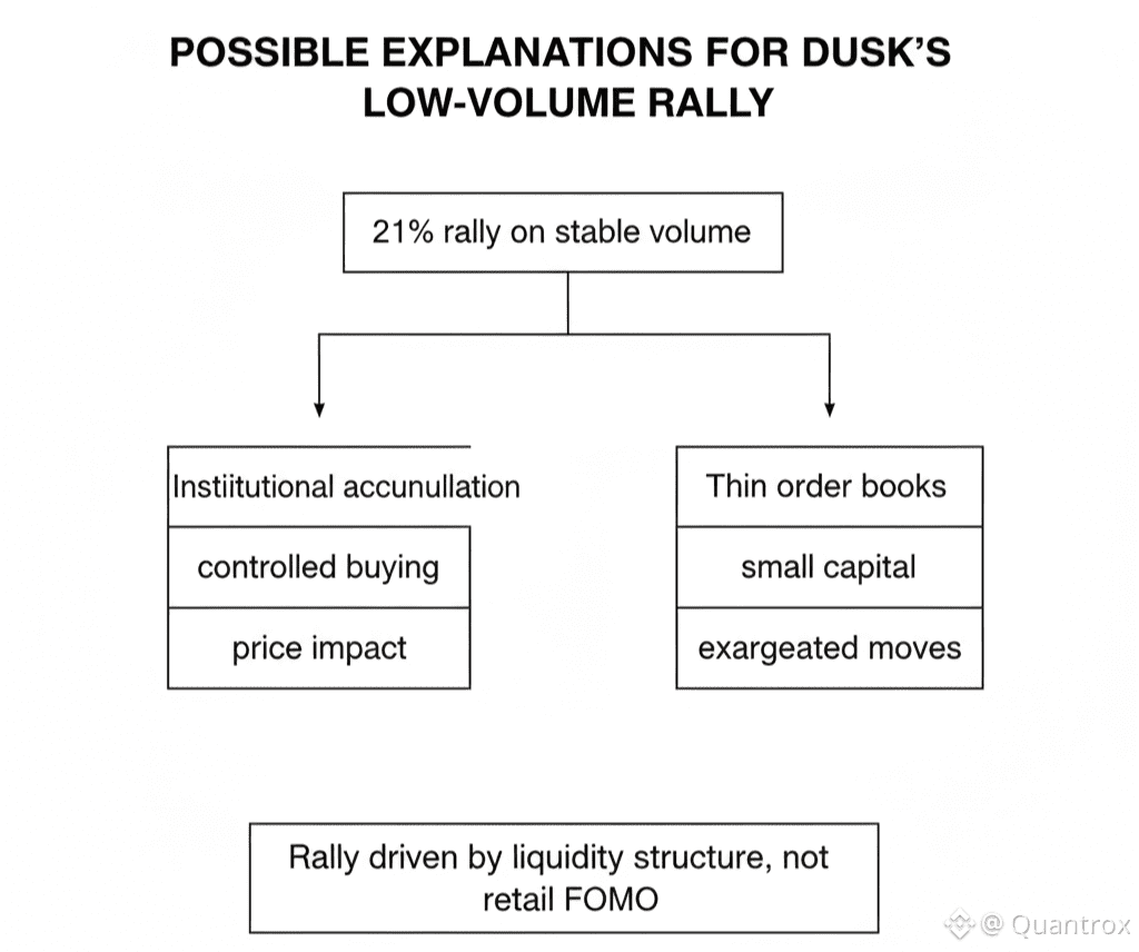 What keeps bothering me is how unusual a 21% rally without proportional volume increase is. Most pumps that size need 3-5x normal volume as momentum builds. Dusk did it on volume barely above consolidation levels. That's either extremely efficient buying from sophisticated actors accumulating without driving price, or low liquidity creating false demand signals that won't sustain.
