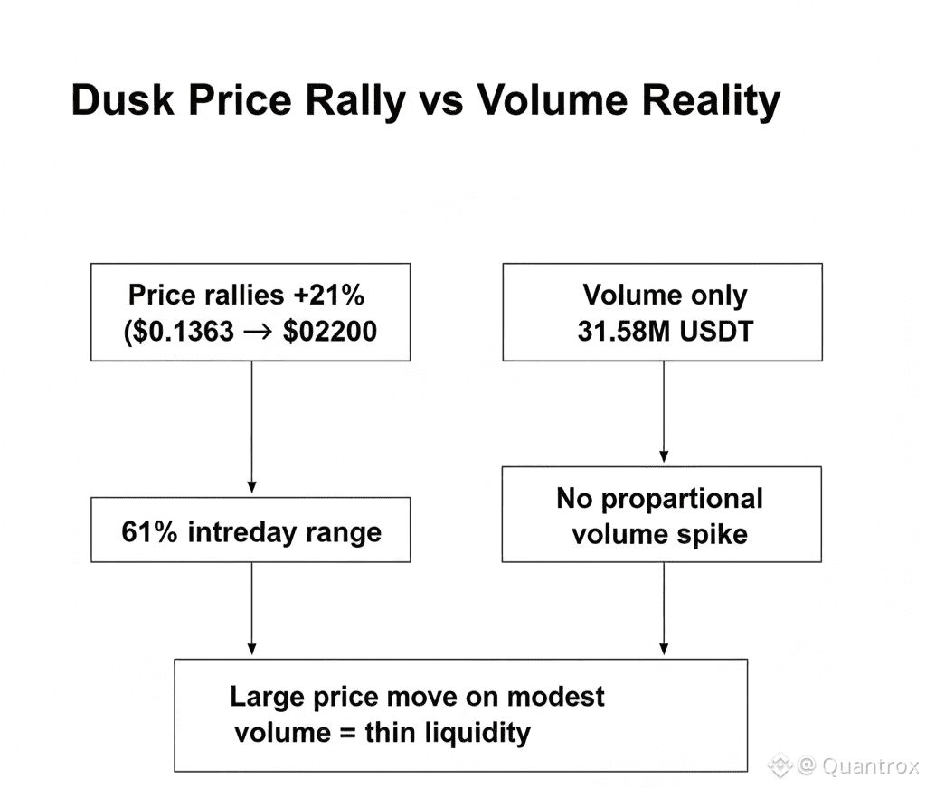 When Dusk jumped 21.42% today from $0.1363 to $0.2200 before settling at $0.1655, I expected exactly that volume explosion. Instead, Dusk traded just 31.58 million USDT on 174.94 million tokens. That's barely higher than recent days when price was dropping. A 21% rally on volume that didn't increase proportionally doesn't add up unless something weird is happening with Dusk's liquidity.