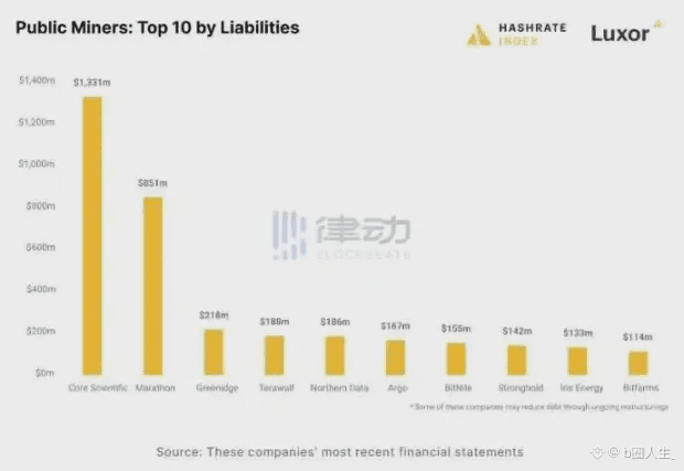 根据 Hashrate Index 的一份报告显示,主流中心化矿企到 2022 年底的集体债务总额超 40 亿美元,其中 Core Scientific 债务最多,截至 2022 年 9 月 30 日欠债权人 13 亿美元;Marathon Digital 欠债约 8.51 亿美元,但大部分是可转换票据;第三债务人是 Greenidge Generation,欠债 2.18 亿美元。