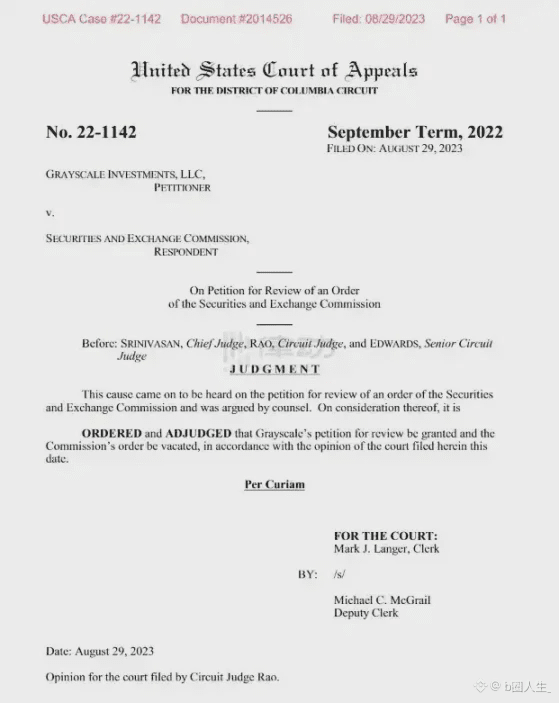 据法庭文件显示,华盛顿一个由三名法官组成的上诉小组推翻了美国证交会(SEC)阻止灰度 ETF 的决定。法院称「拒绝灰度的提议是武断和反复无常的,因为 SEC 未能解释对类似产品的不同处理。」