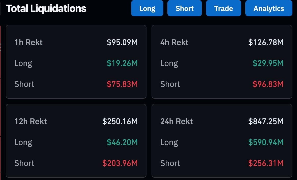 ~850 milionów USD zleceń dźwigniowych kryptowalut zostało zlikwidowanych w ciągu ostatnich 24 godzin