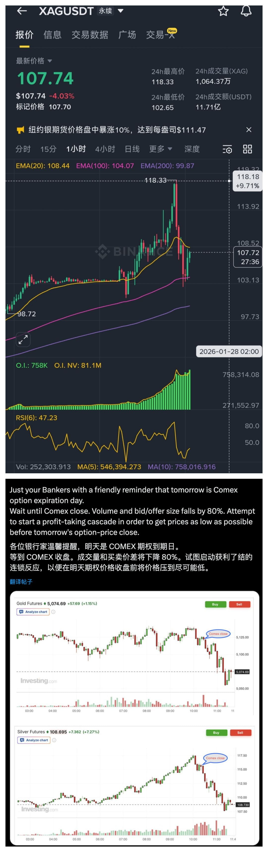 而市场迅速将矛头指向了 COMEX 期权行权日。根据芝商所(CME)的安排,2026 年 1 月的期金与期银合约确于 1 月 28 日到期。这种“行权日压价”的解释在情绪面上极具煽动性:投资者普遍认为大资金会在结算前故意砸盘,利用流动性下降的窗口期,将价格压低以获取期权结算利益。